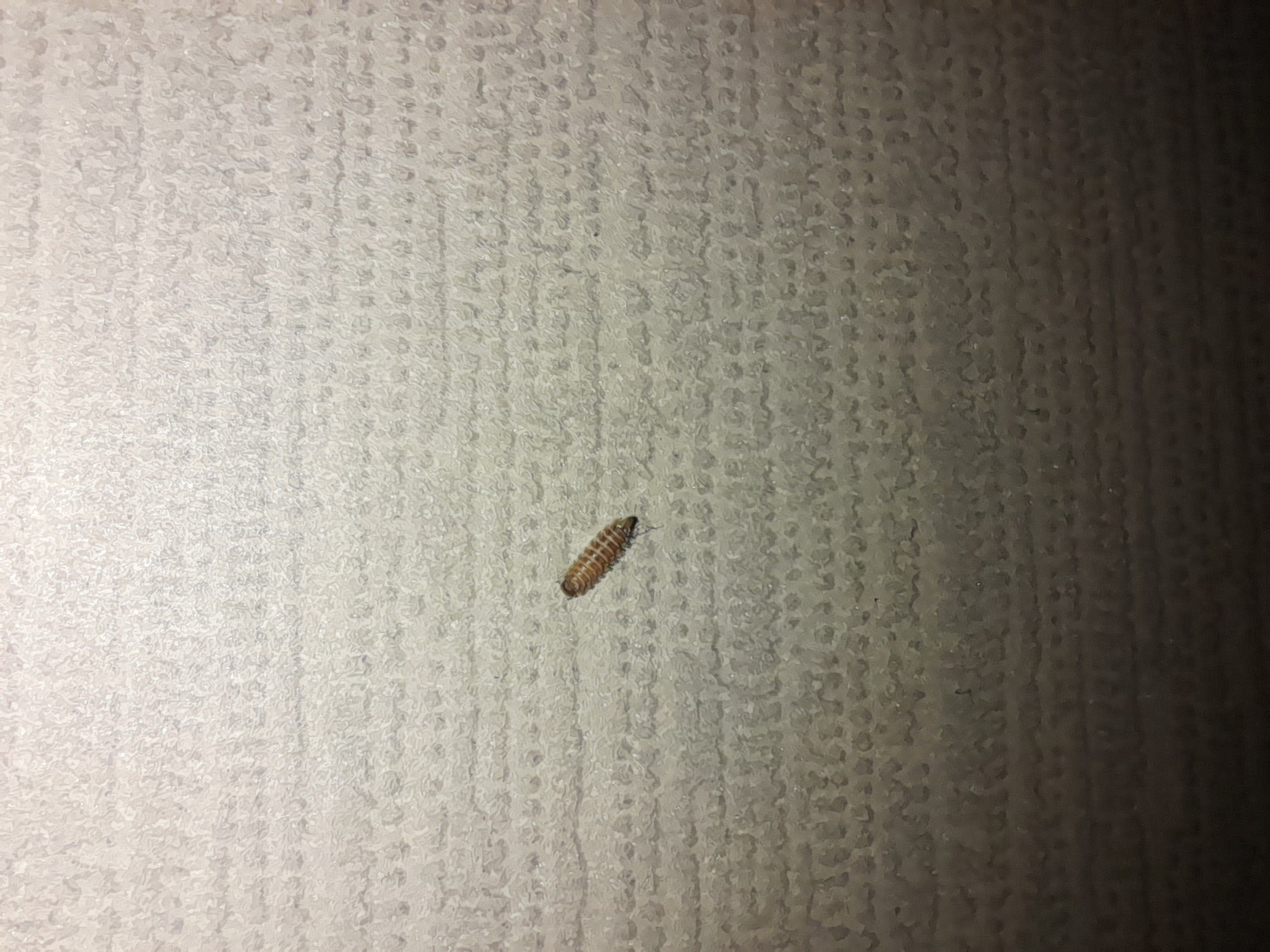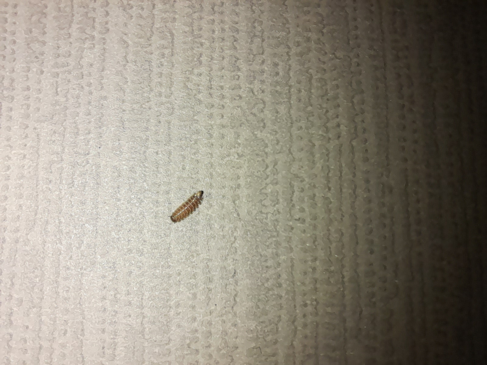 Kuvien perusteella kyseessä voisi olla riesakuoriaisen toukka. Tässä linkki Ympäristökeskuksen ja Helsingin kaupungin tekemään hyvään kodin tuholaisesitteeseen, jossa on kuvat kodin hyönteisistä: