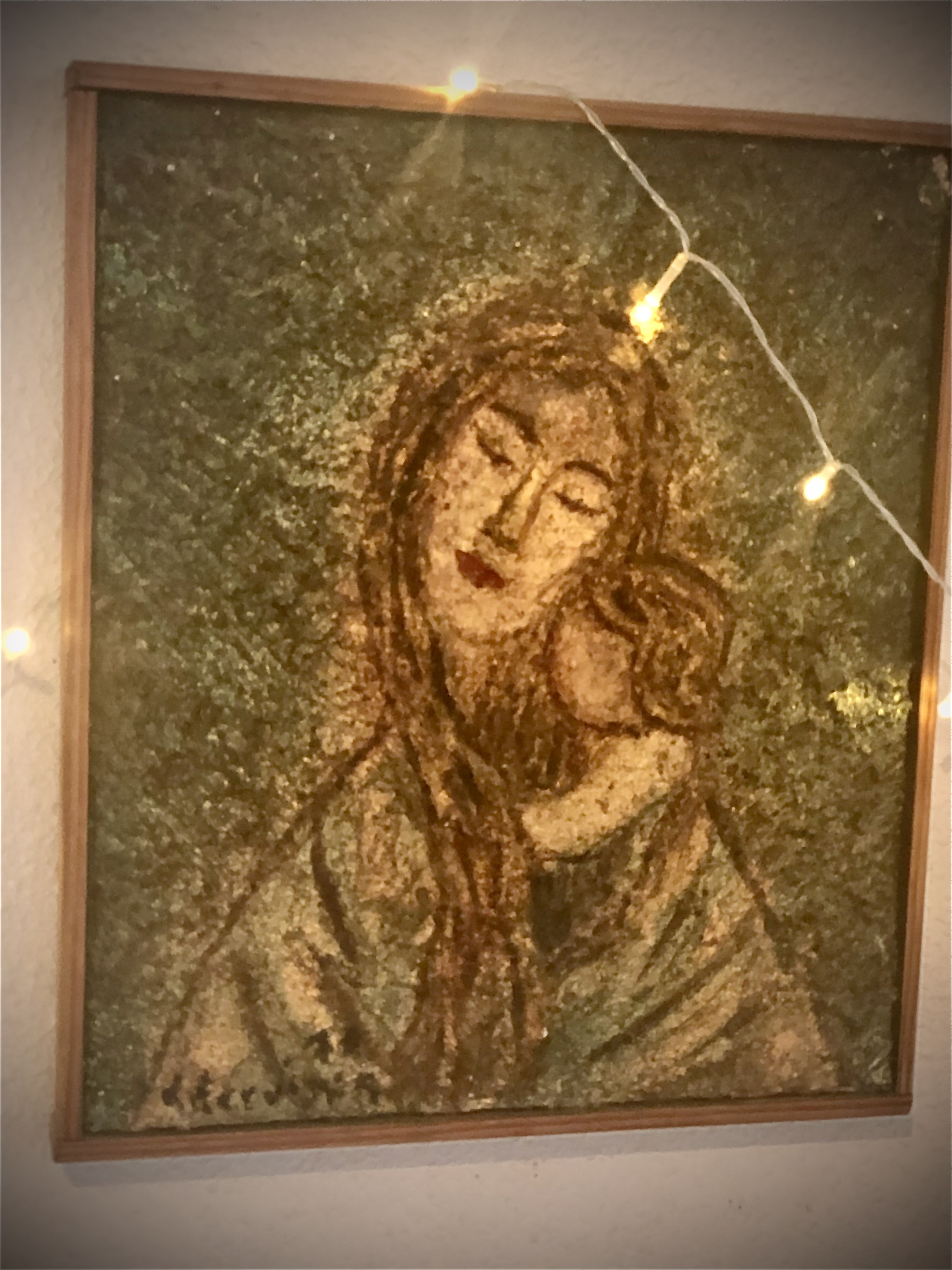 Kyseessä Keijo Kervinen. Hän teki poliittista sarjakuvaa, mutta myös näitä Maria ja Jeesus-lapsi tauluja. Wikipediassa on artikkeli hänestä.