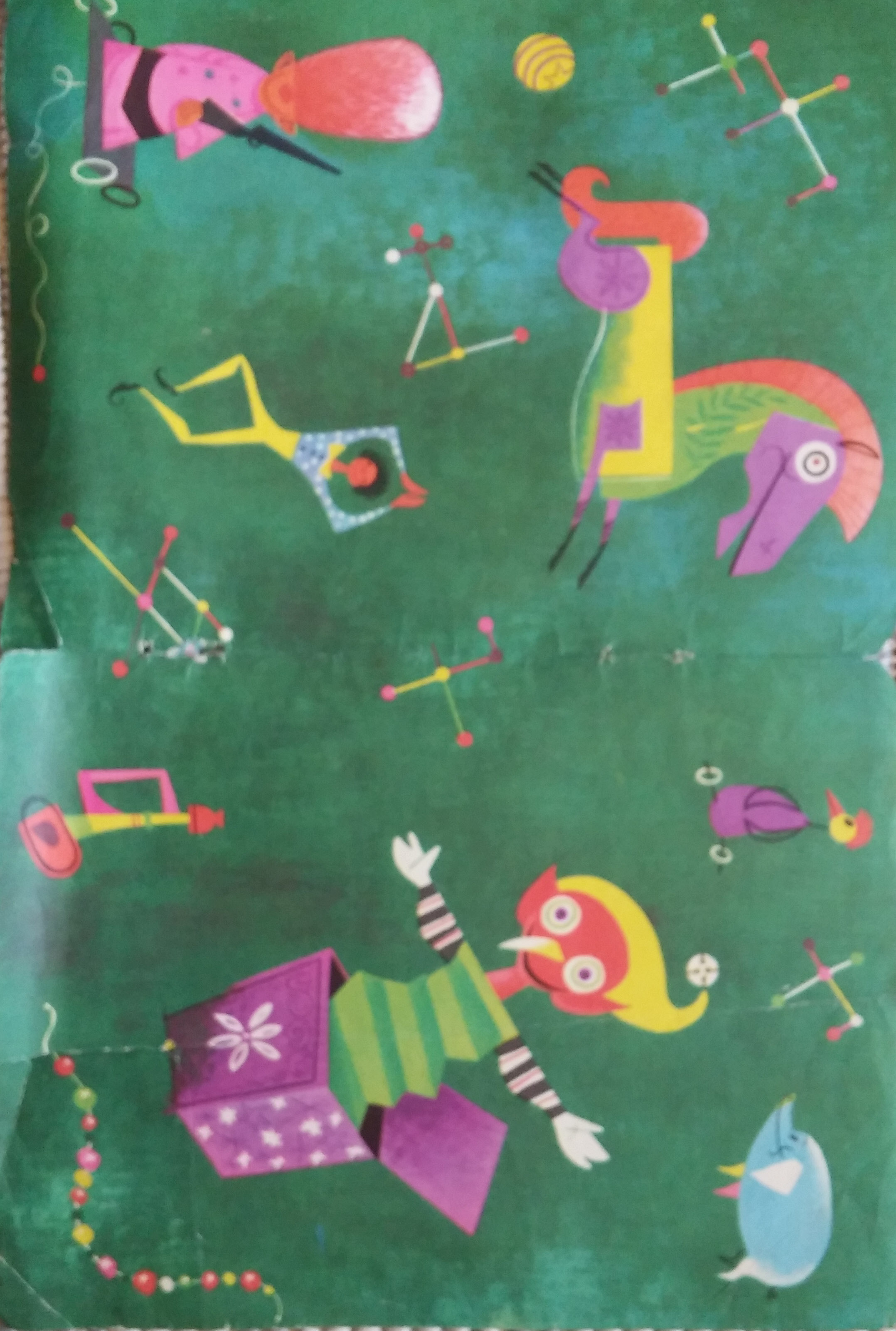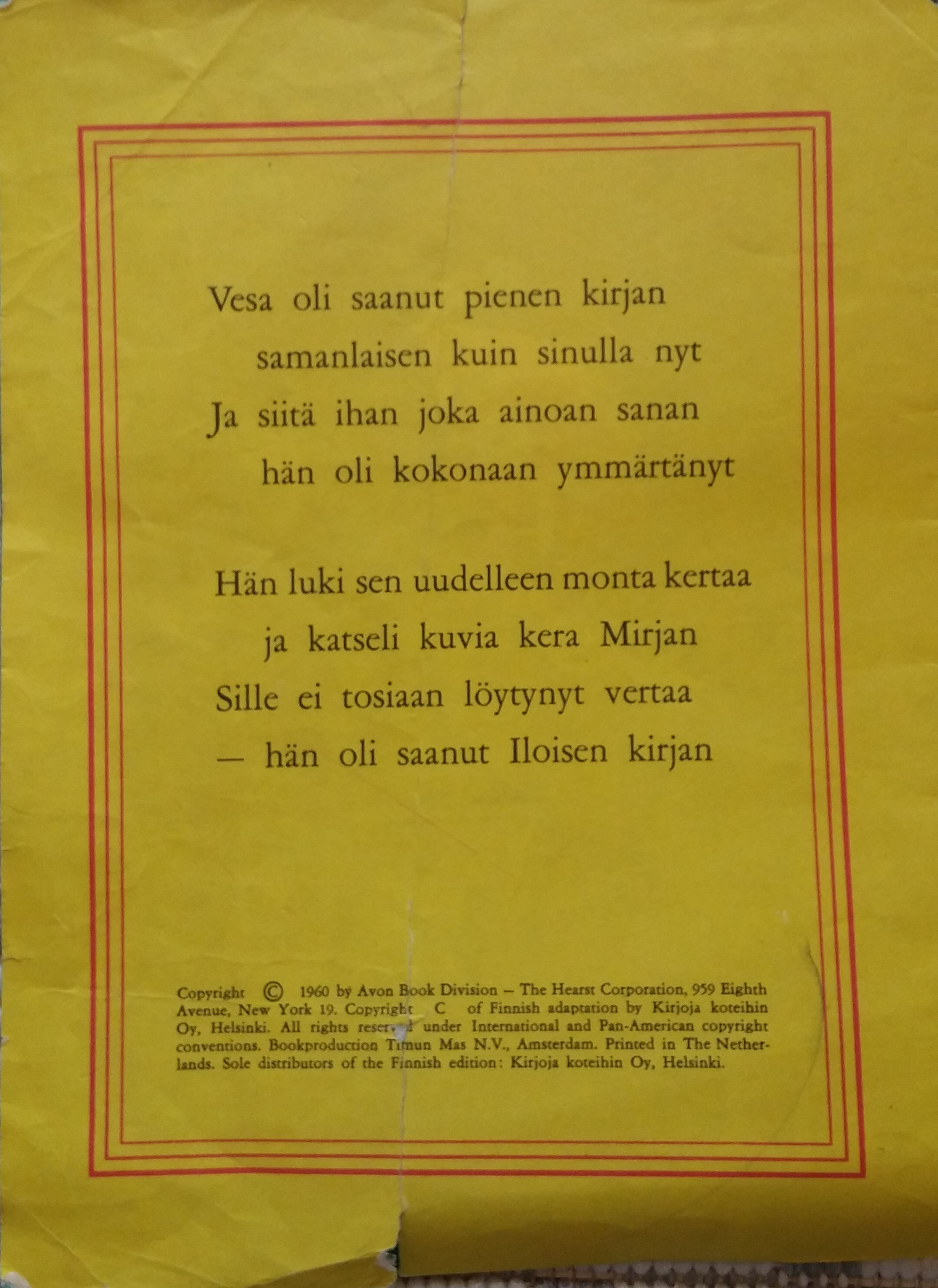 Hei, mikä lasten kuvakirja mahtaa olla kysymyksessä? Kirjassa nuket Kaaleppi ja Karoliina pakenevat lelukaupasta lelujunalla kukkaniittyjen halki. Kirja on ollut olemassa jo 1960-luvulla, koska olen lukenut sitä taaperona ja olen syntynyt 1963. Ohessa olevat kuvat ovat ainut, mitä minulla on jäljellä kirjasta. Toivottavasti niistä on apua.