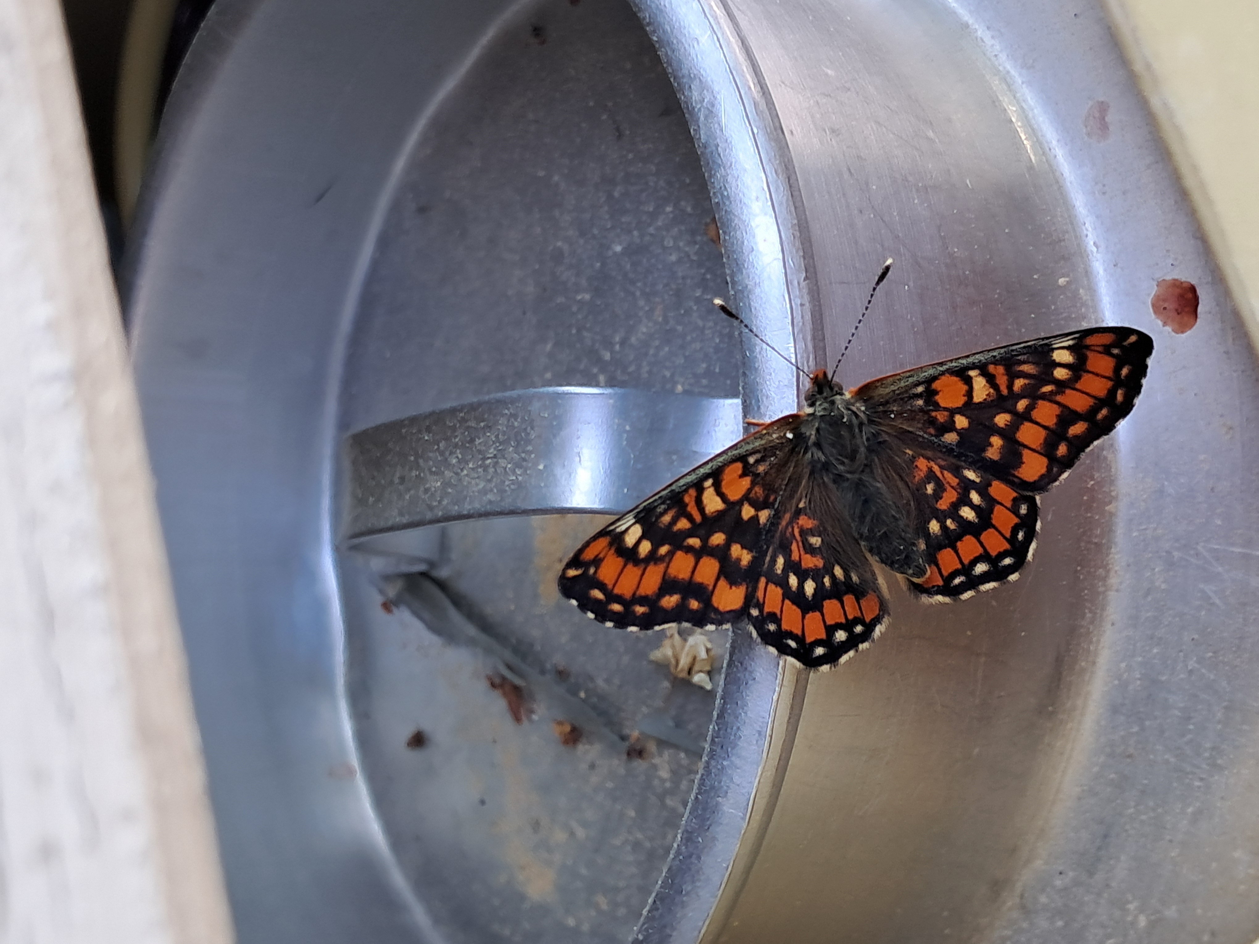 15.6. Joutsassa aamulla havaittiin vaimon kanssa rantasaunan penkin alla kuvan mukainen - ilmeinen päiväperhonen. Siihen sopivaa lajitunnistekuvaa en löytänyt Euroopan Hyönteiopaskirjasta, enkä hetimiten nettikuvistakaan löytänyt vastaavaa. Vaimo ehdotti karttaperhosta, mutta siipien päällyskuvioitus ei oikein mielestäni täsmää. Siipien alapuolta emme valitettavasti nähneet/kuvanneet. Mistähän perhoslajista tässä saattaisi olla kyse?
