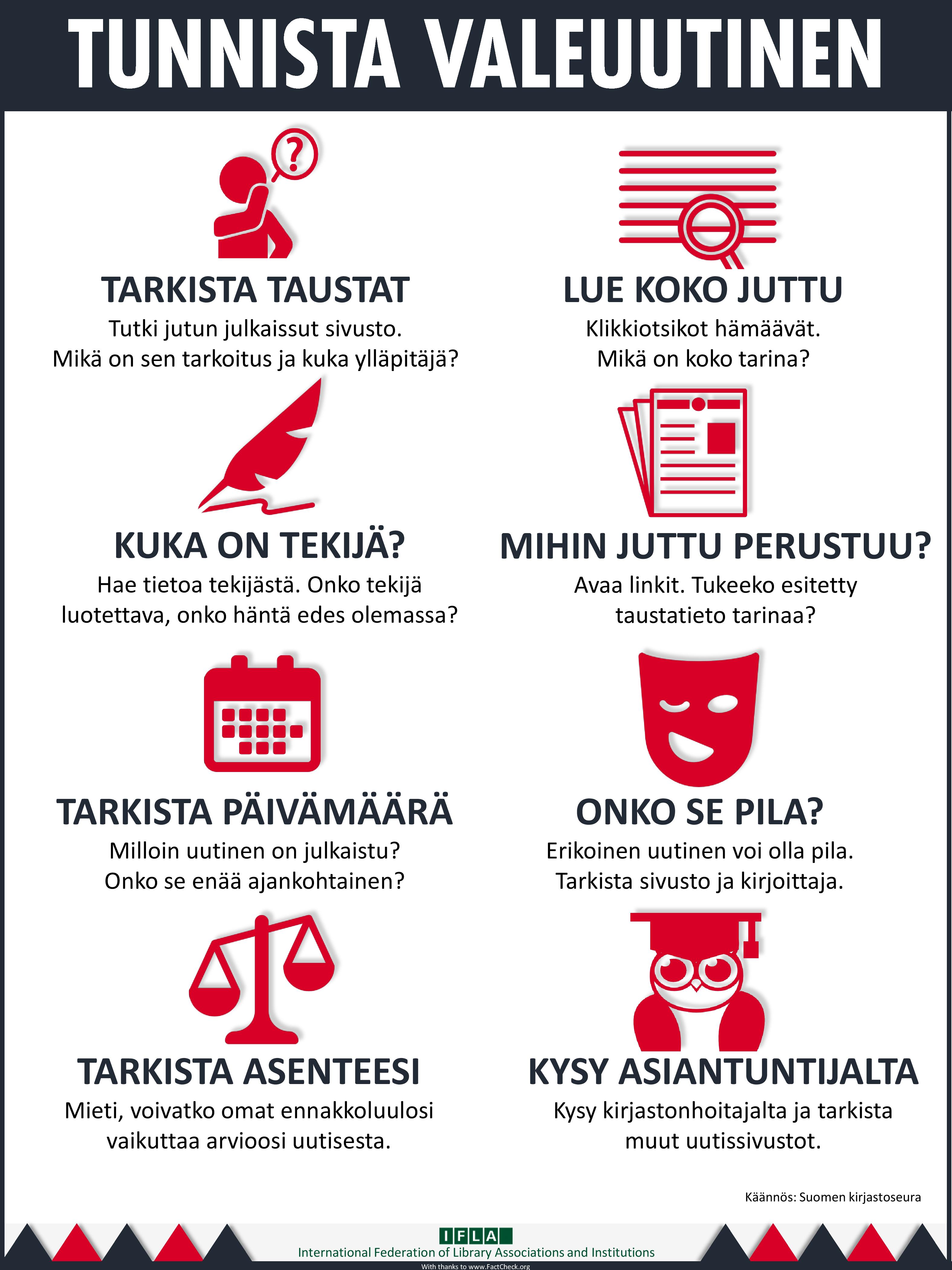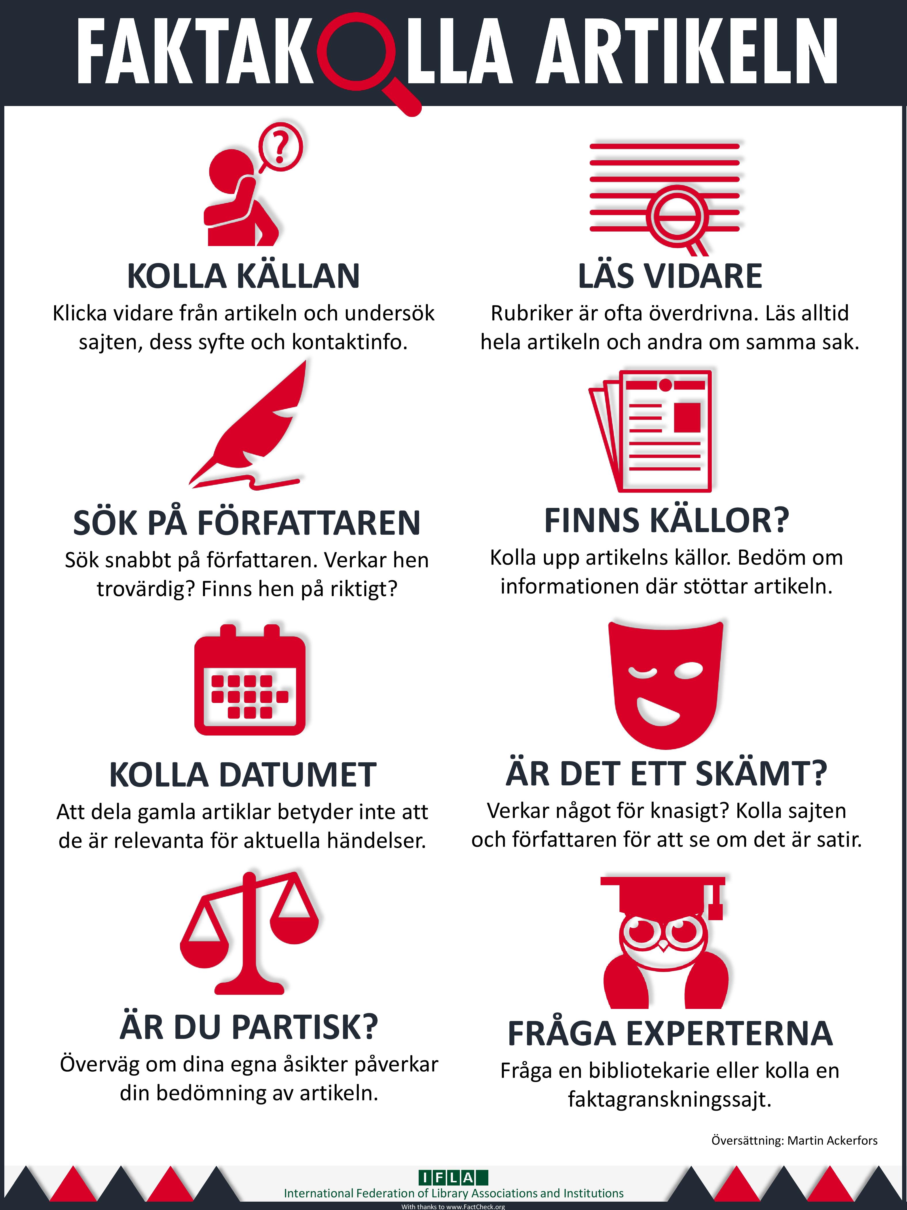 IFLA har gjort en affisch om hur man genomskådar falska nyheter. Affischen har översatts till svenska och finska. Affischerna kan laddas ner på många olika språk (som pdf- eller jpg-filer) på från sidan: http://www.ifla.org/node/11174. Affischen får fritt användas och spridas.